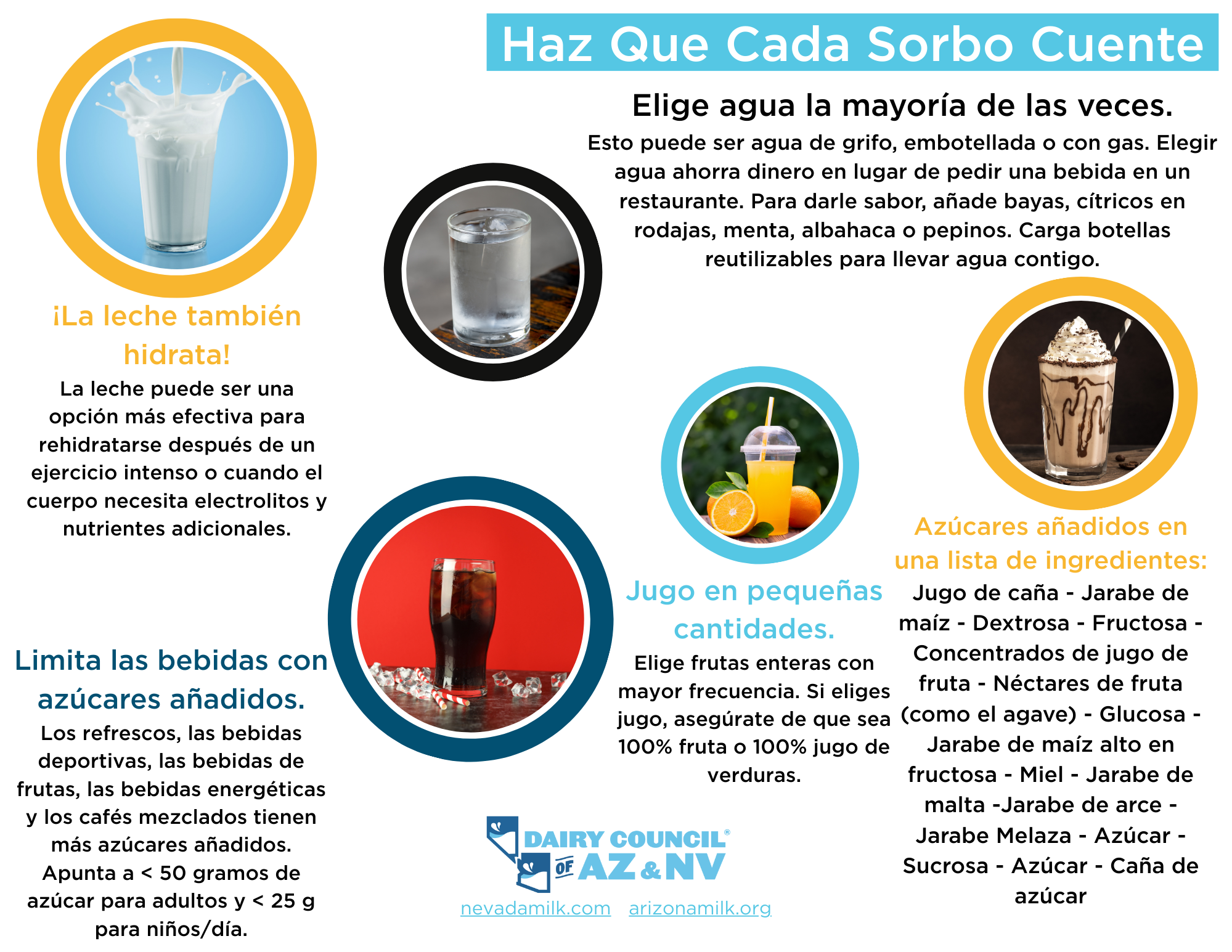 Make Every Sip Count tip sheet educates families how beverages impact health while providing guidance on better beverage choices. These are double-sided with one side in English and one side in Spanish.